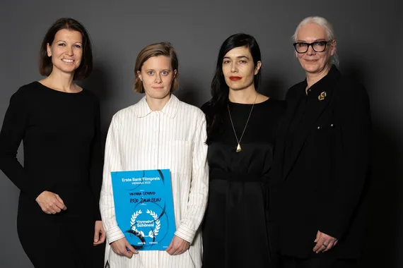 Katharina Egger (Sponsoring Erste Bank), Erste Bank Filmpreis – Vermehrt Schönes! Preisträgerin Viktoria Schmid (ROJO ŽALIA BLAU), Festivaldirektorin Eva Sangiorgi und Jurysprecherin Silvia Bohrn | © Viennale/ Alexi Pelekanos