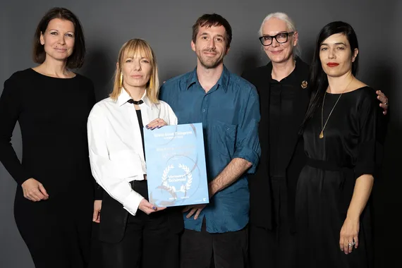 Katharina Egger (Sponsoring Erste Bank), Erste Bank Filmpreis – Vermehrt Schönes! Preisträger Elsa Kremser und Levin Peter (WHITE SNAIL), Jurysprecherin Silvia Bohrn und Festivaldirektorin Eva Sangiorgi | © Viennale/ Alexi Pelekanos